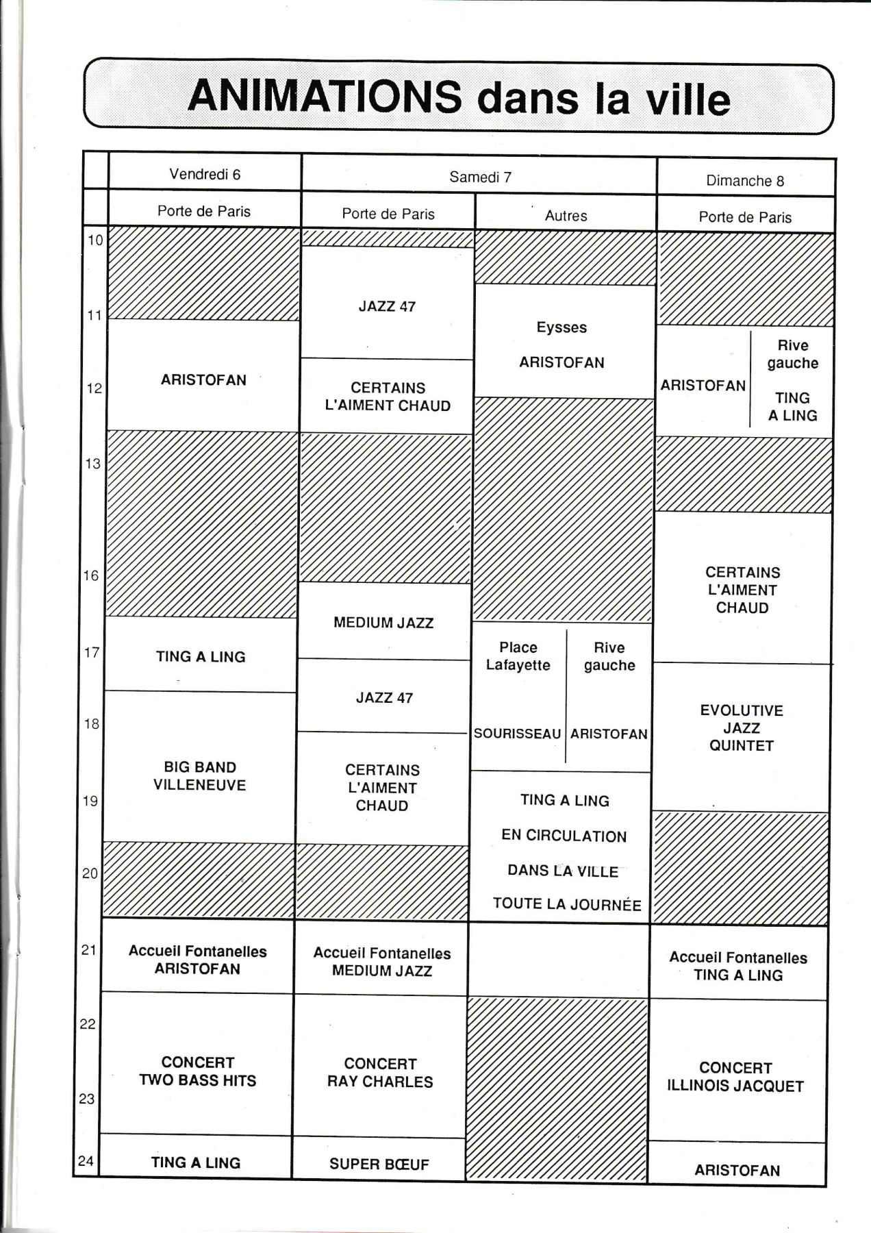 Après le succès populaire des musiques de la Louisiane et de la Nouvelle Orleans, les travaux de la nouvelle mairie entraînèrent une restructuration du Parc Anatole France et il ne fut plus possible de trouver en ville un site adéquat pour y organiser un village de boutiques et restaurants autour d’ une scène centrale. Cette perte de convivialité plus une réduction drastique de subvention en 2002 signèrent la fin de ces merveilleuses années du Jazz en Villeneuvois.